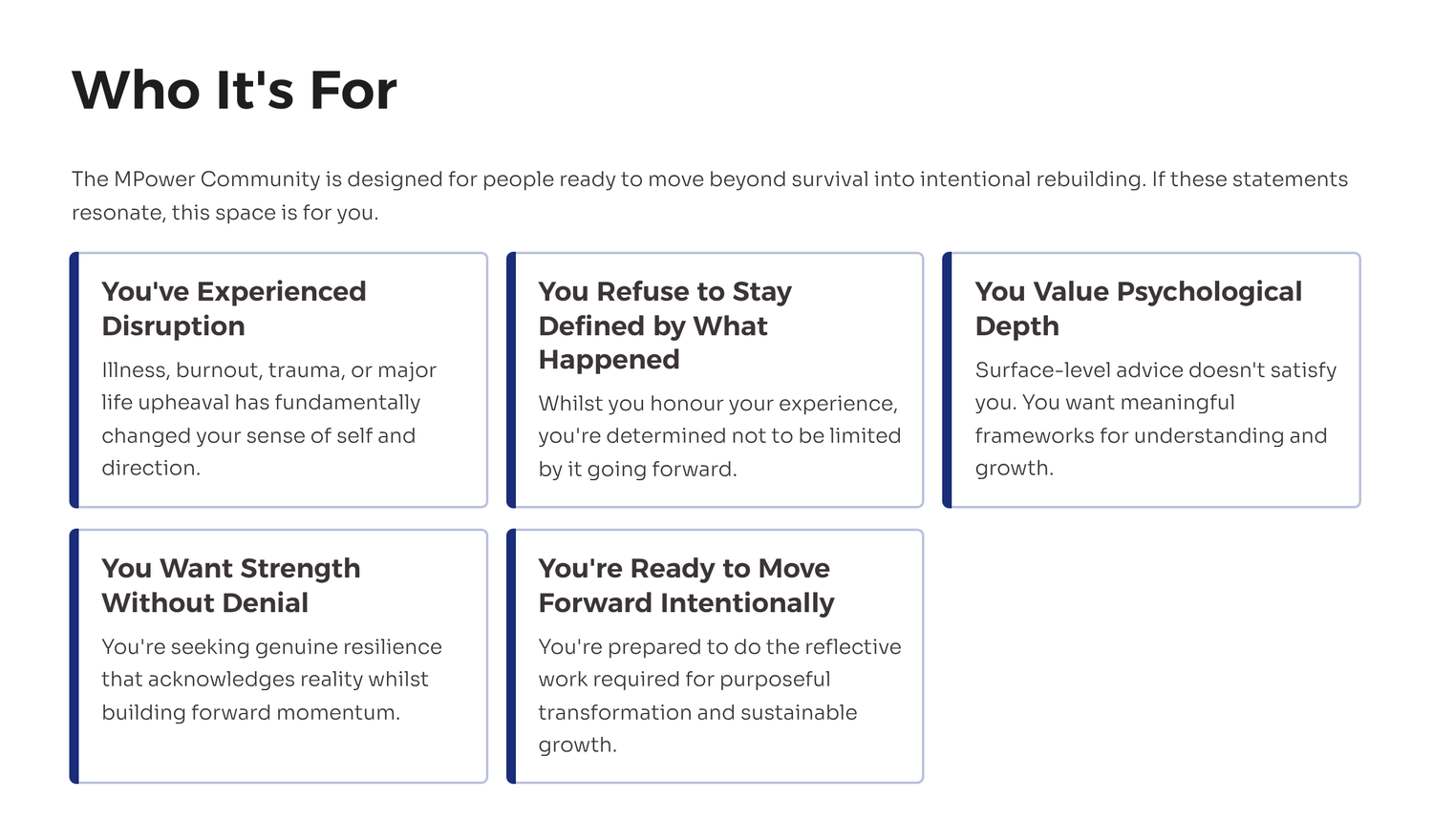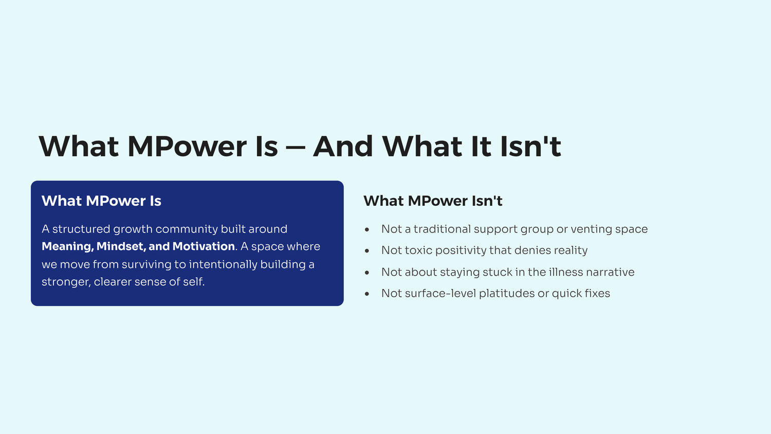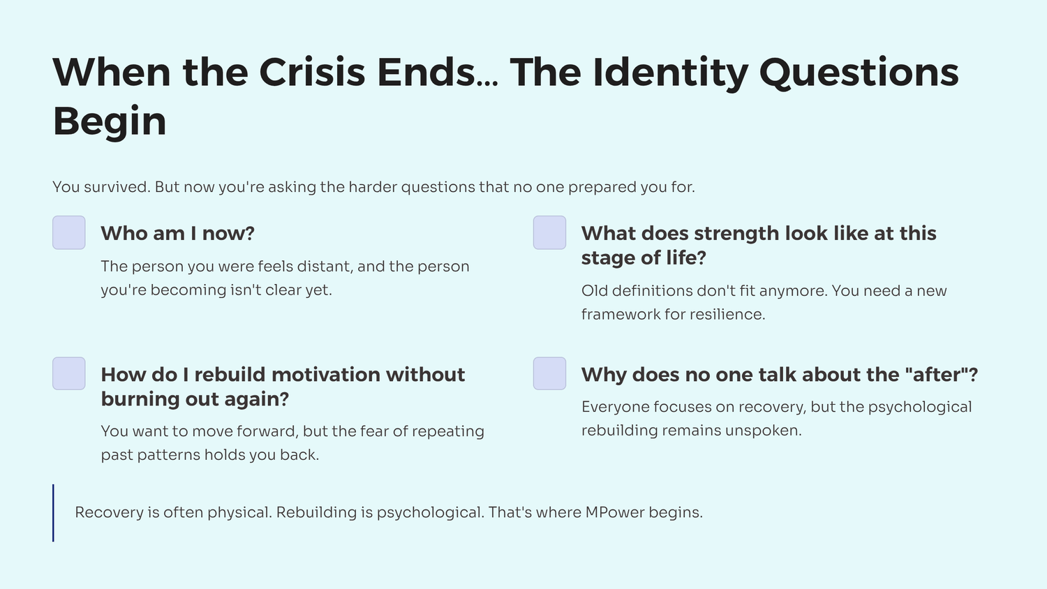 The MPower Community is a space for rebuilding identity, strengthening mindset, and sustaining motivation after illness, burnout, trauma, or life disruption.