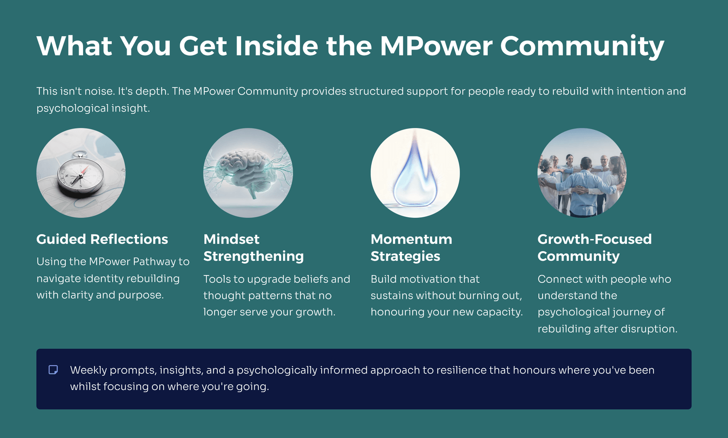 Join a community that understands the psychological terrain of rebuilding. Whether you start with the workbook, the Facebook group, or dive straight into the full MPower Community, you're taking a courageous step towards intentional transformation.